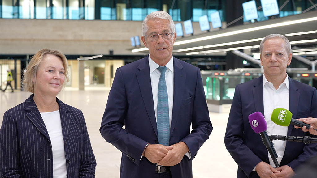 In the first test trip in October, one of the new people mover trains very slowly travels just a few meters on the finished route. All of the new vehicles are now being gradually put through their paces on a separate test track – first manually and then in automatic mode. After the new Terminal 3 opens in 2026, the fully automatic vehicles will carry up to 4,000 passengers an hour in each direction between it and Terminal 1 with a stop at Terminal 2. The travel time is just under eight at a top speed of 80 km/h.
